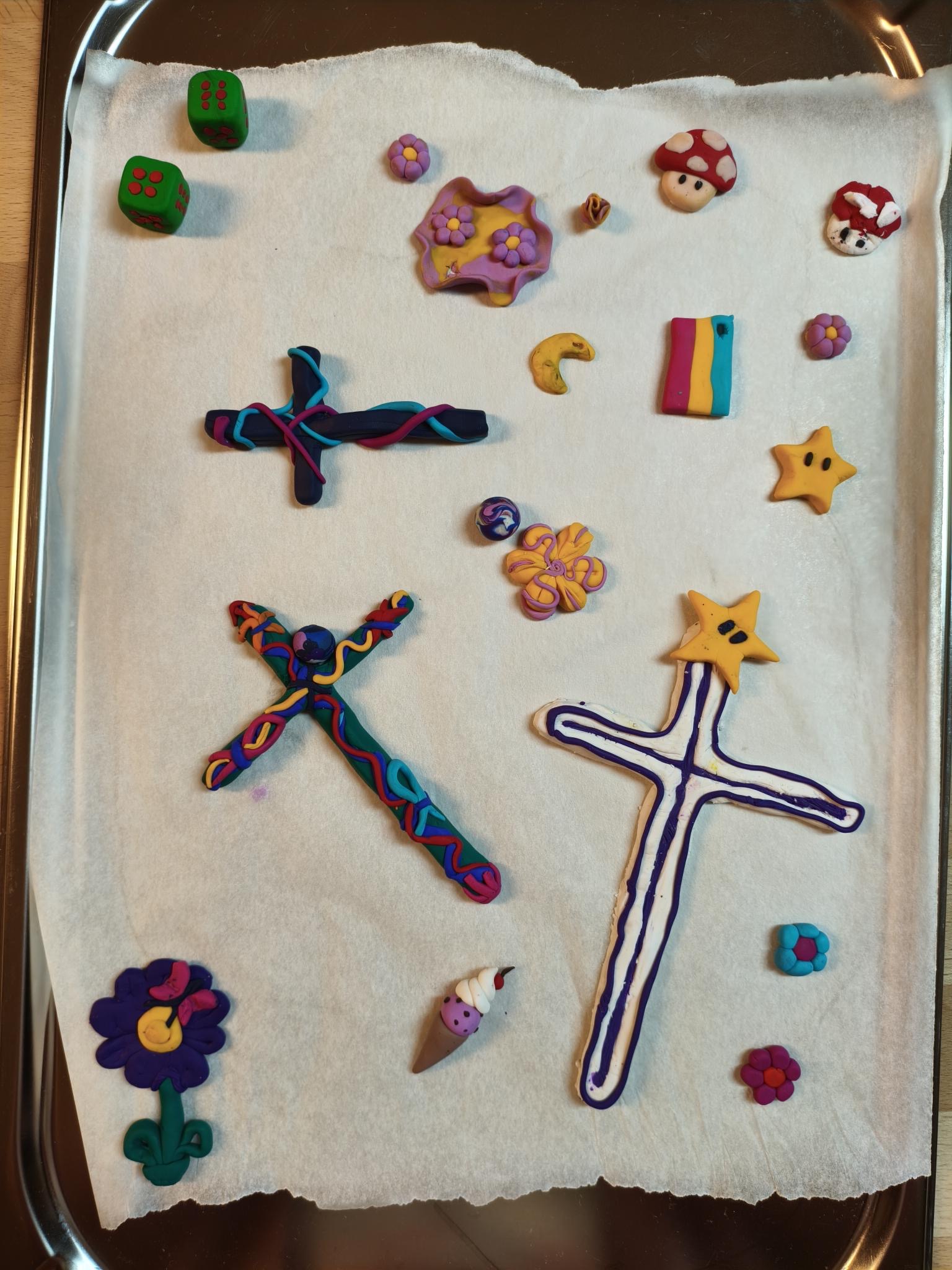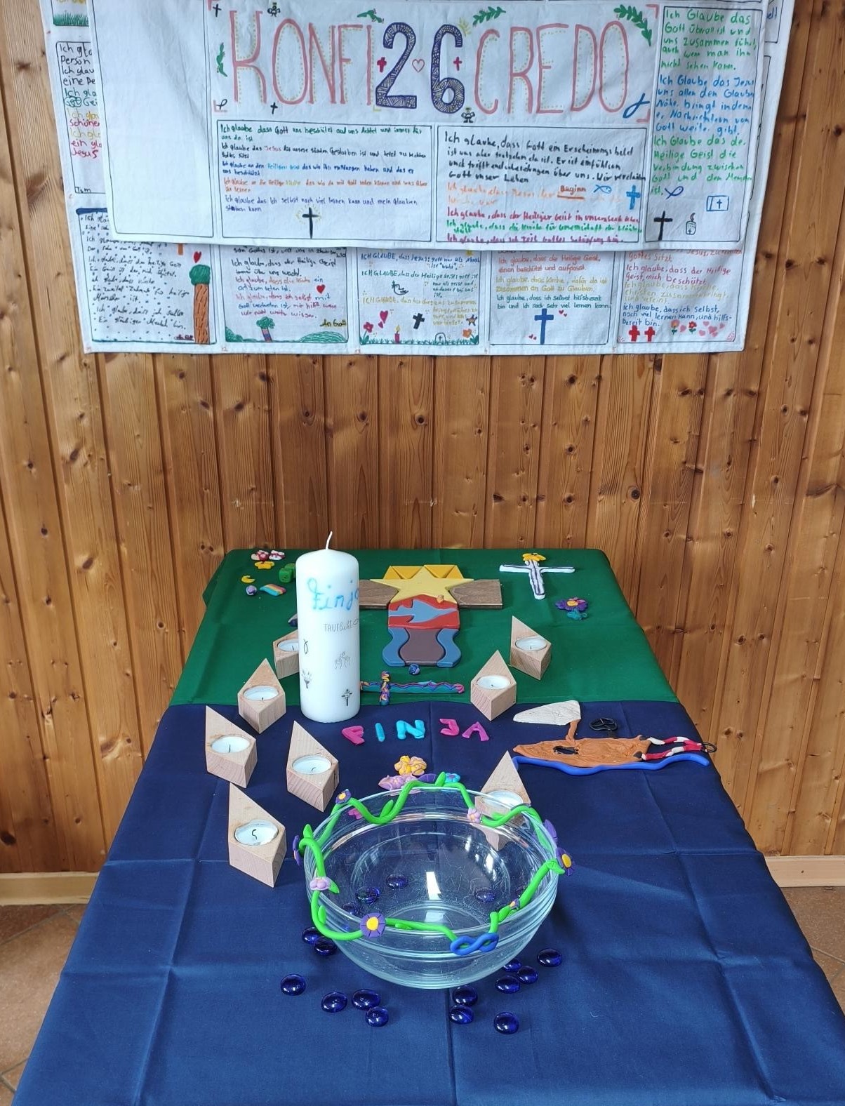 Unser inhaltliche Arbeit haben wir mit dem Thema Taufe begonnen. In dem Zusammenhang haben wir unsere Konfi-Kerzen gestaltet und Tauf-Kreuze modelliert.
